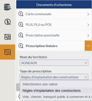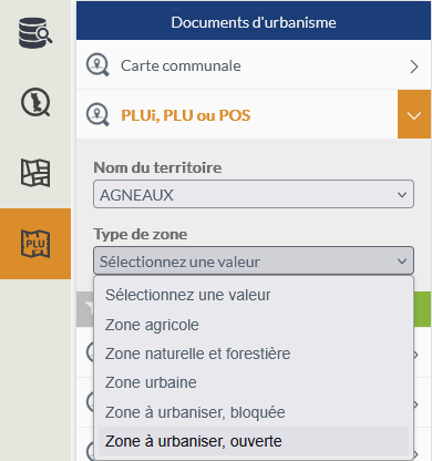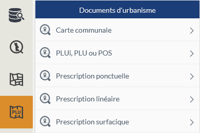 , accessible depuis le panneau latéral gauche, permet d'accéder aux recherches concernant les zonages et prescriptions des documents d'urbanisme (PLUi, PLU, POS et cartes communales).