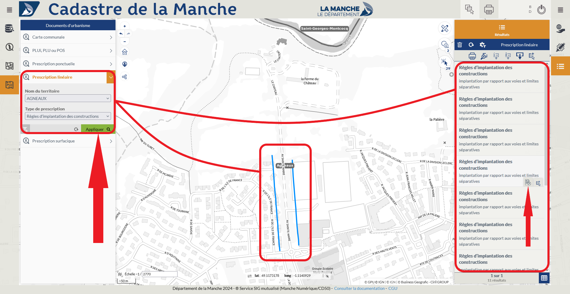 Exemple : Recherche des prescriptions linéaires "Règles d'implantation des constructions" sur le territoire d'Agneaux.