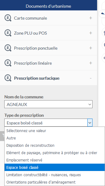 Pour rechercher une ou plusieurs prescriptions surfaciques, l'utilisateur sélectionne d'abord un territoire à partir d'une liste déroulante préfiltrée sur les seuls territoires disposant de prescriptions surfaciques puis choisit un type de prescription.