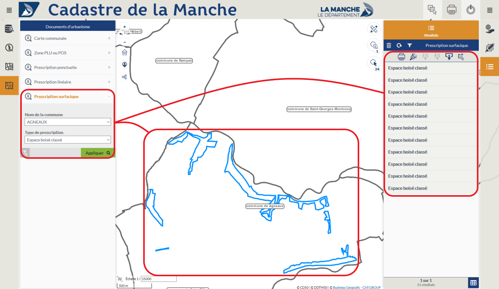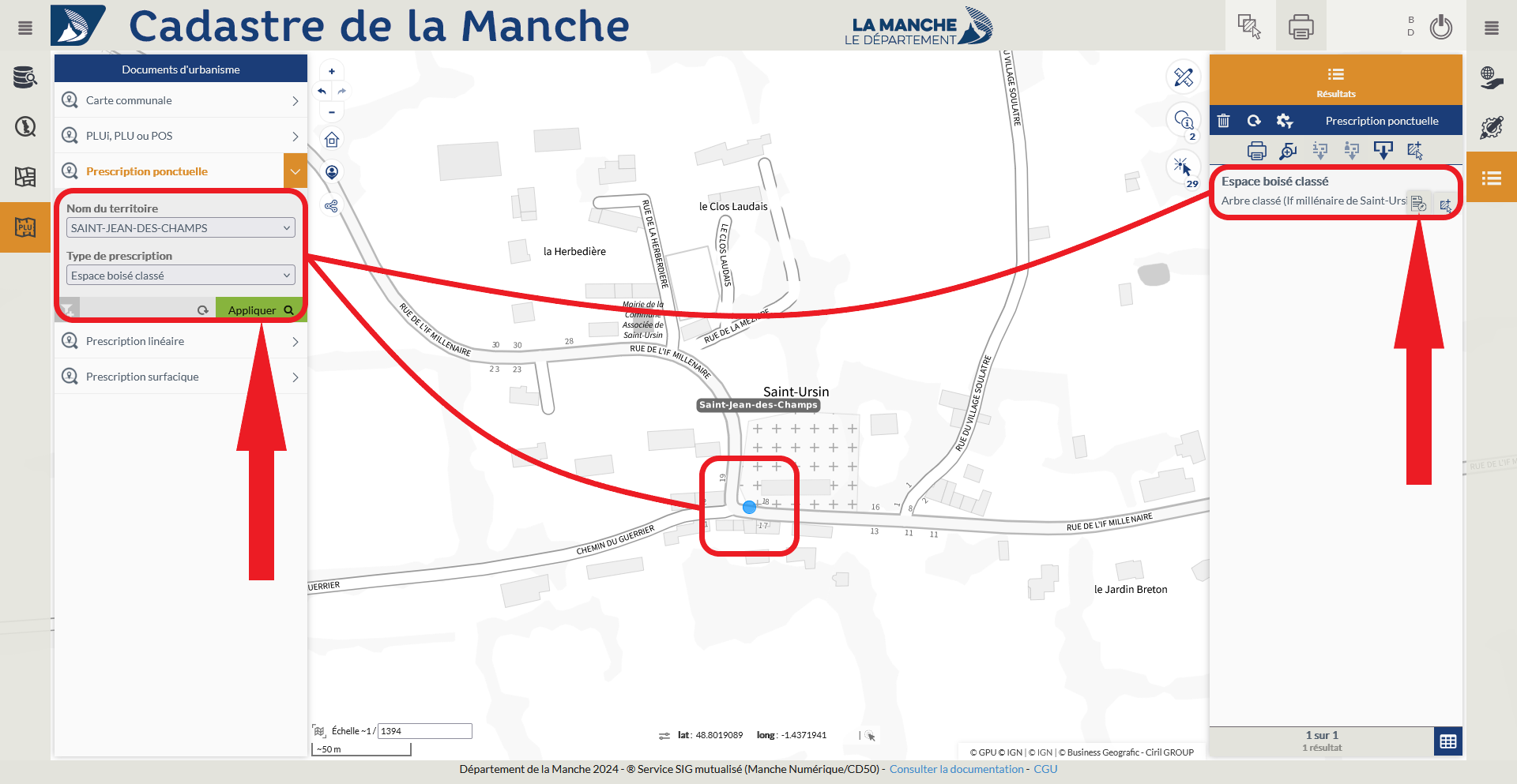 Exemple : Recherche des prescriptions ponctuelles "Espace boisé classé" sur le territoire de Saint-Jean-des-Champs.