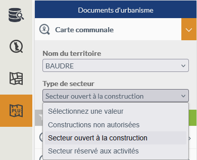 L'utilisateur sélectionne d'abord une commune à partir d'une liste déroulante préfiltrée sur les seules communes disposant d'une carte communale puis choisit un type de secteur.