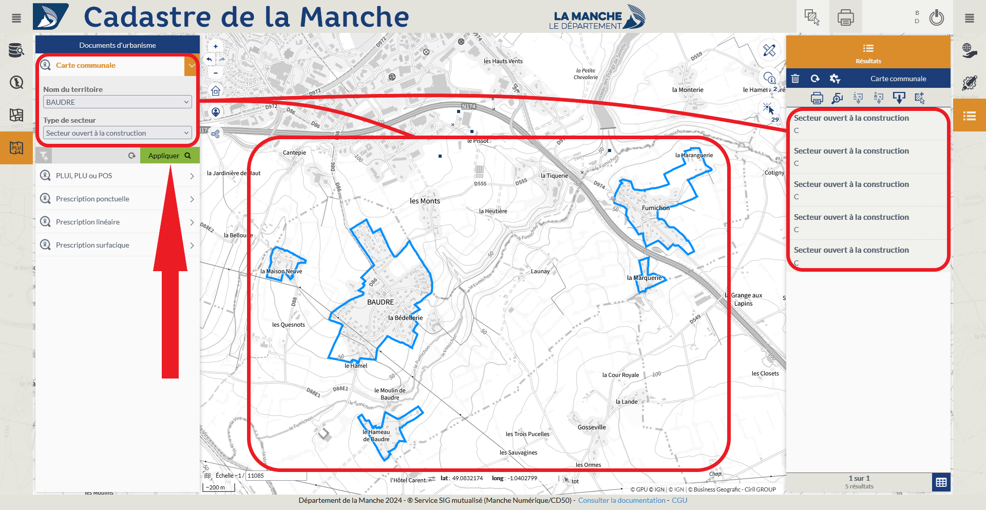 Exemple : Recherche des secteurs ouverts à la construction sur la commune de Baudre.