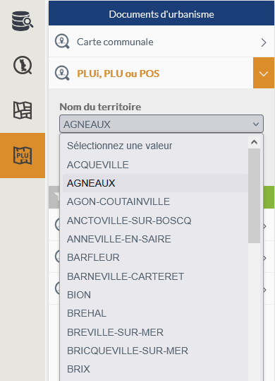 L'utilisateur sélectionne d'abord un territoire à partir d'une liste déroulante préfiltrée sur les seuls territoires disposant d'un PLUi, PLU ou POS :