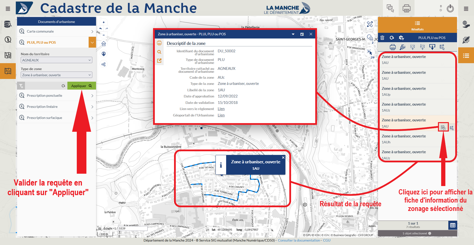 Exemple : Recherche des zones PLUi, PLU ou POS "Zone à urbaniser, ouverte" sur le territoire d'Agneaux.