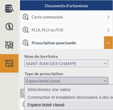 Pour rechercher une ou plusieurs prescriptions ponctuelles, l'utilisateur sélectionne d'abord un territoire à partir d'une liste déroulante préfiltrée sur les seuls territoires disposant de prescriptions ponctuelles puis choisit un type de prescription.