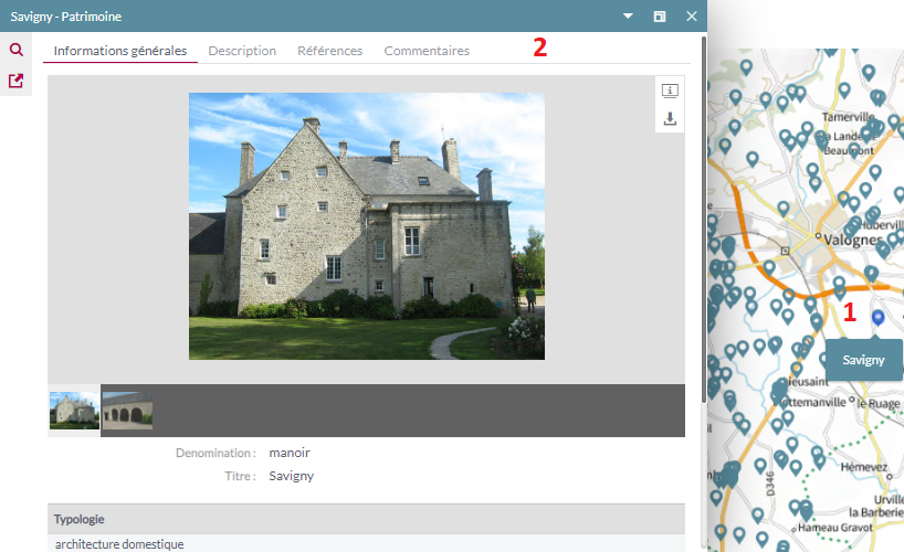 1- réaliser un clic sur l'élément patrimonial directement sur la vue carte.