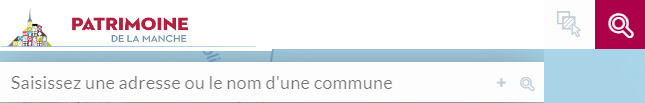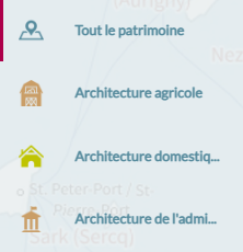 On retrouve les onglets des thématiques principales réparties par typologies de patrimoine; l'utilisateur à aussi la possibilité d'afficher l'ensemble des éléments du patrimoine de la Manche :